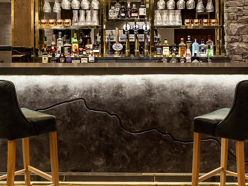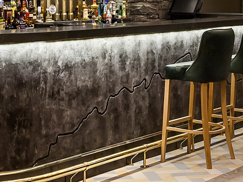 The ‘Stove’ restaurant is where you can see applicArt’s polished plaster finishes, the finishes applied to the ‘Stove’ bar front and feature wall are Black Stucco Da Vinci with Silver Metallique, with a large indented vein detail for added depth and character.